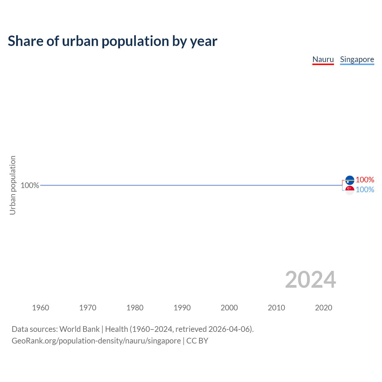 From 2004 to 2024, the share of urban population changed from 100% to 100% in Nauru and from 100% to 100% in Singapore.