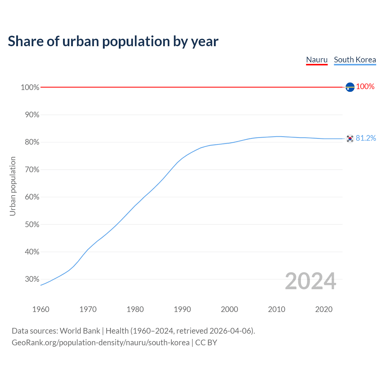 From 2004 to 2024, the share of urban population changed from 100% to 100% in Nauru and from 81.1% to 81.2% in South Korea.