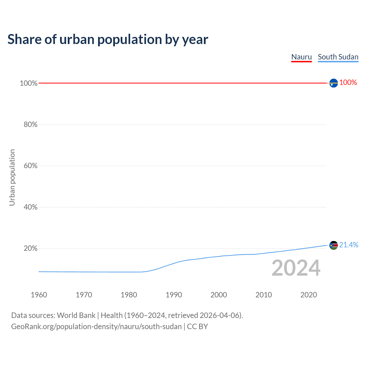 From 2004 to 2024, the share of urban population changed from 100% to 100% in Nauru and from 16.8% to 21.4% in South Sudan.