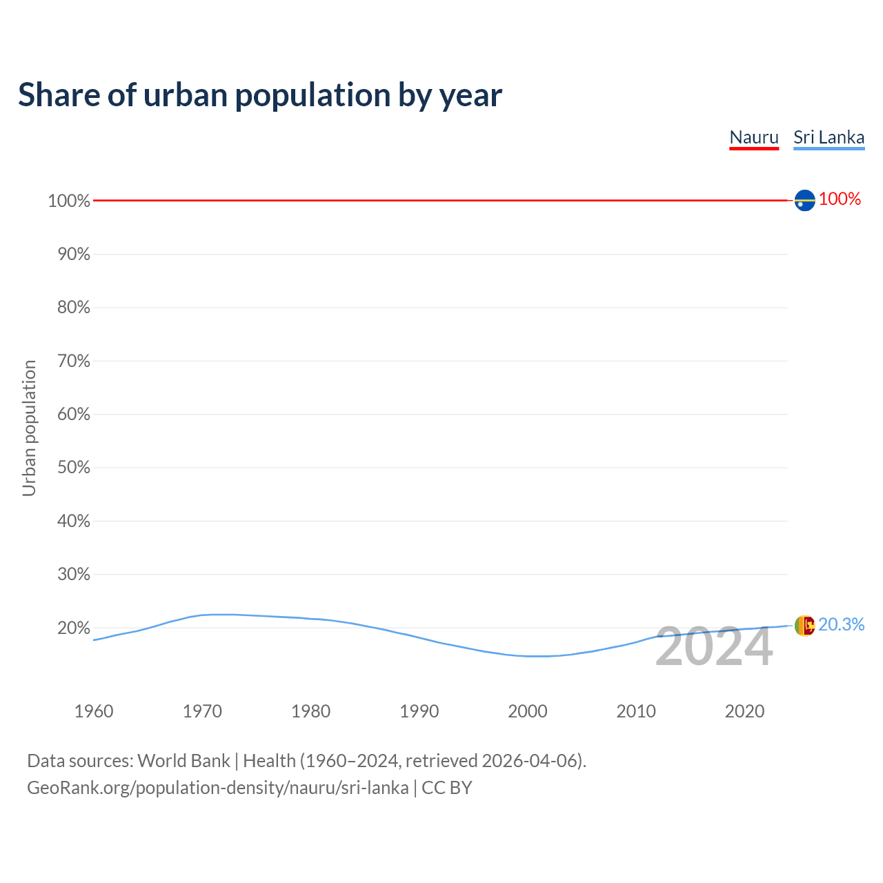 From 2004 to 2024, the share of urban population changed from 100% to 100% in Nauru and from 14.9% to 20.3% in Sri Lanka.