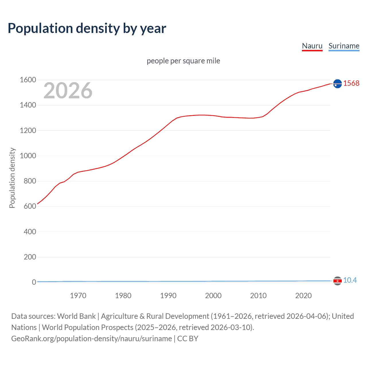 From 2006 to 2026, population density in Nauru increased by 20.6%, compared to a 22.9% growth in Suriname.