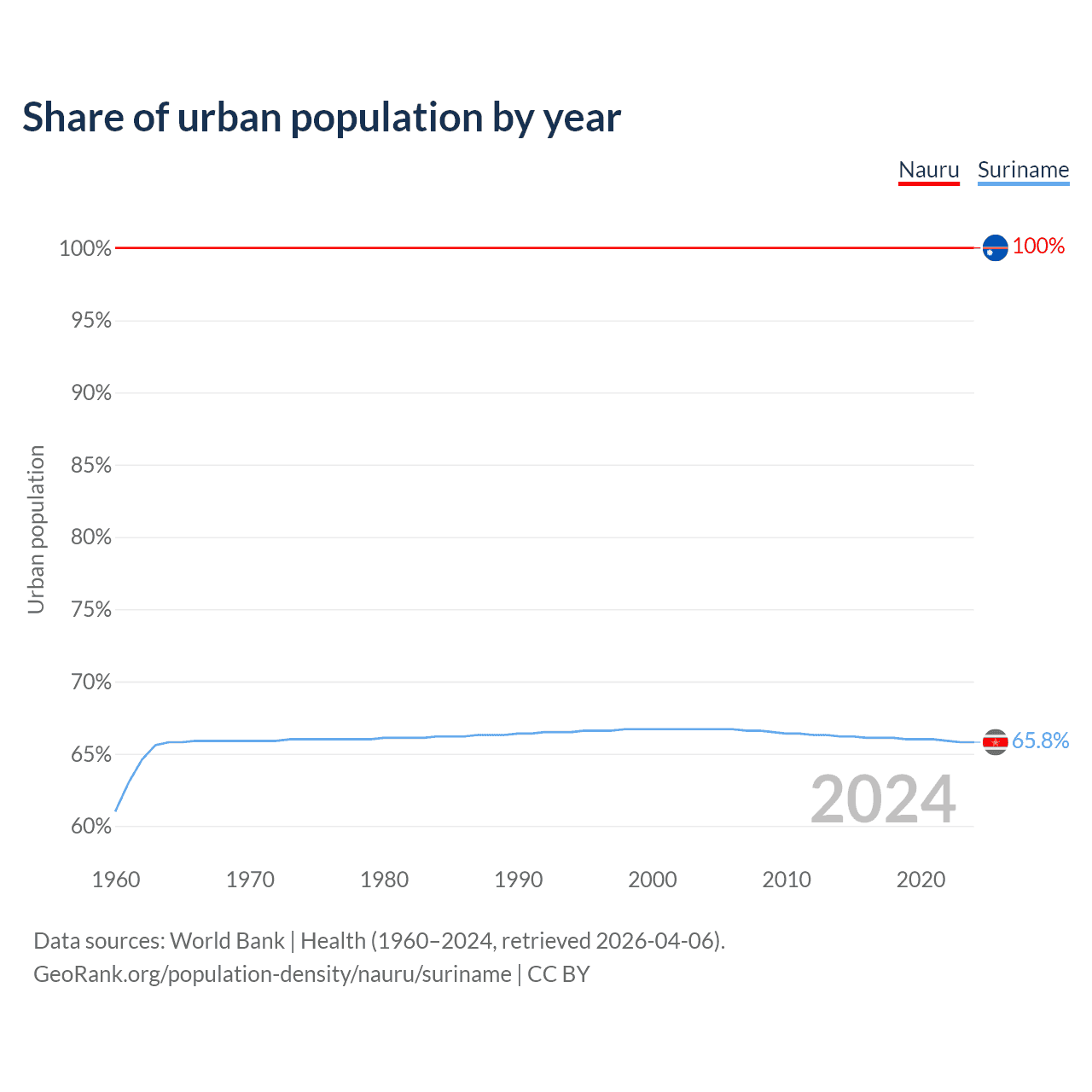 From 2004 to 2024, the share of urban population changed from 100% to 100% in Nauru and from 66.7% to 65.8% in Suriname.