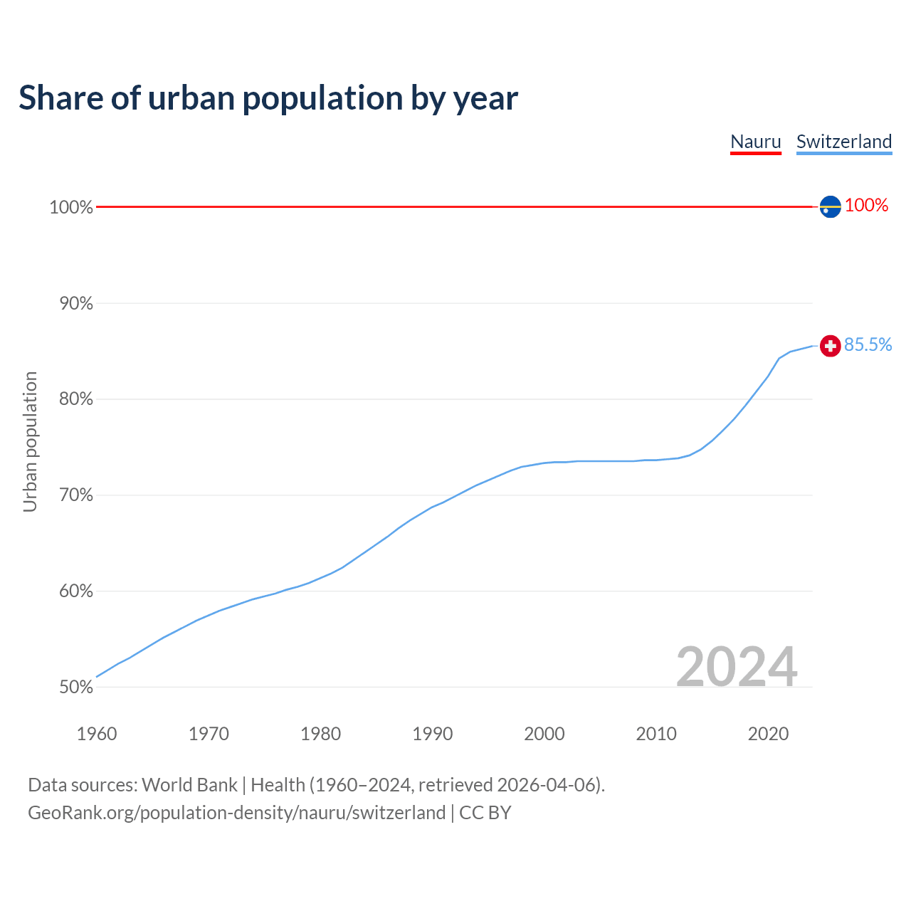 From 2004 to 2024, the share of urban population changed from 100% to 100% in Nauru and from 73.5% to 85.5% in Switzerland.