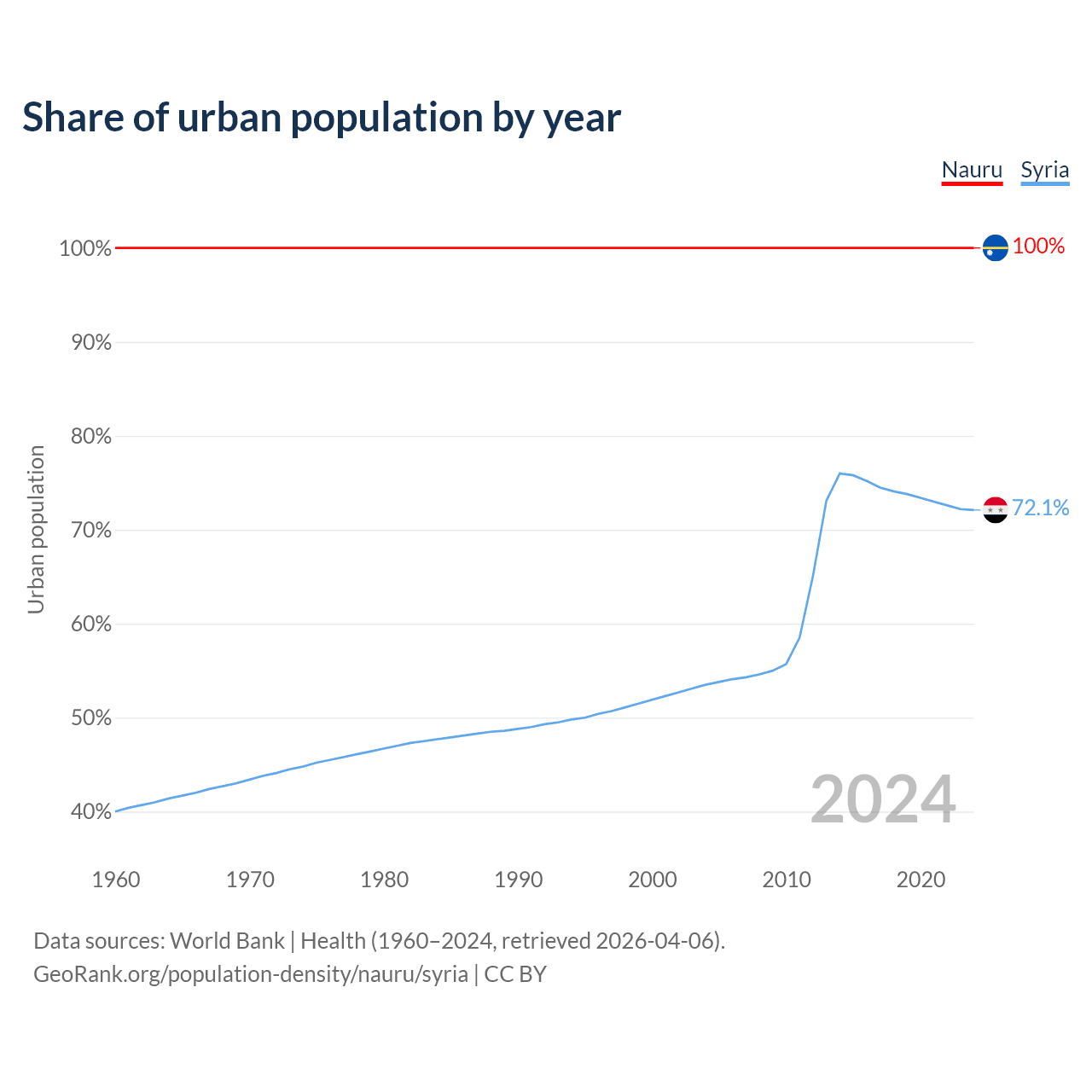 From 2004 to 2024, the share of urban population changed from 100% to 100% in Nauru and from 53.5% to 72.1% in Syria.
