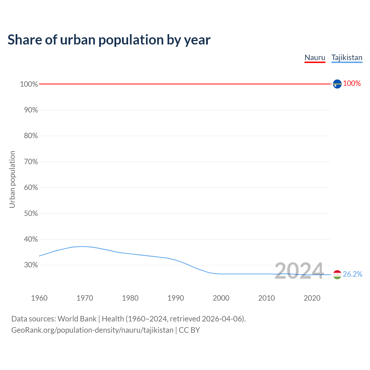 From 2004 to 2024, the share of urban population changed from 100% to 100% in Nauru and from 26.5% to 26.2% in Tajikistan.