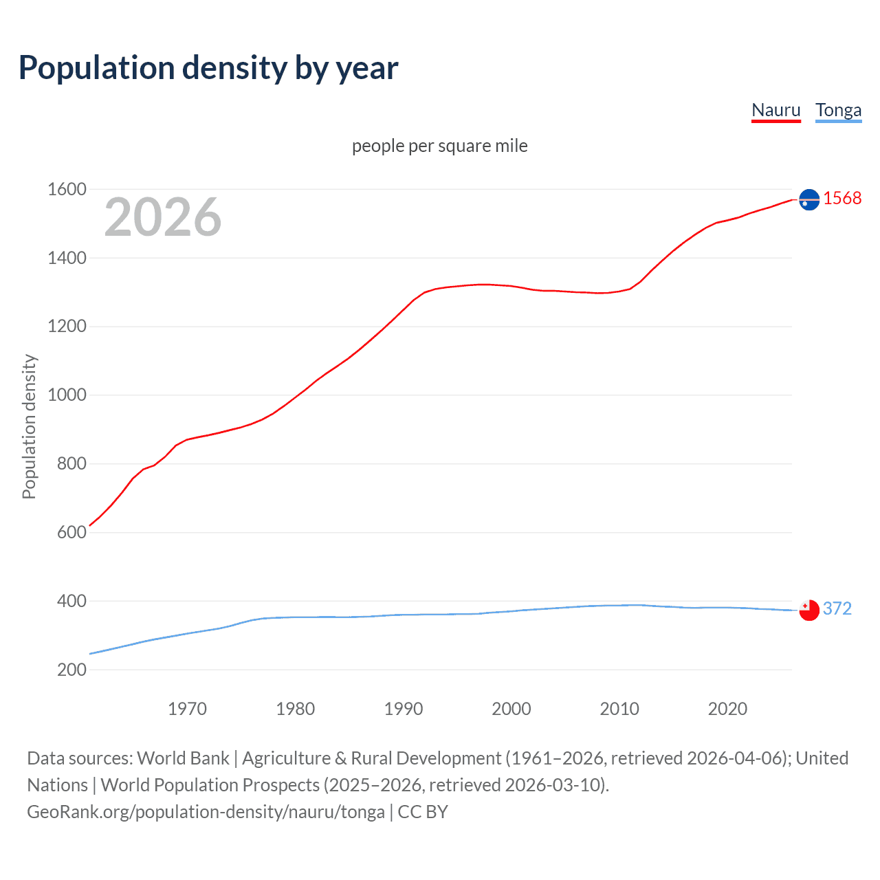 From 2006 to 2026, population density in Nauru increased by 20.6%, compared to a 2.77% decline in Tonga.