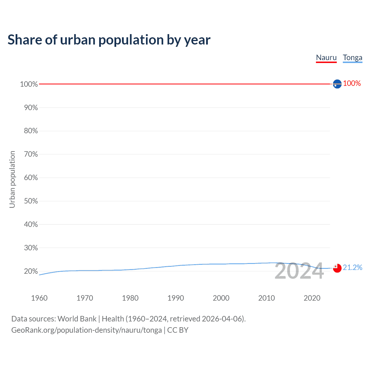 From 2004 to 2024, the share of urban population changed from 100% to 100% in Nauru and from 23.1% to 21.2% in Tonga.