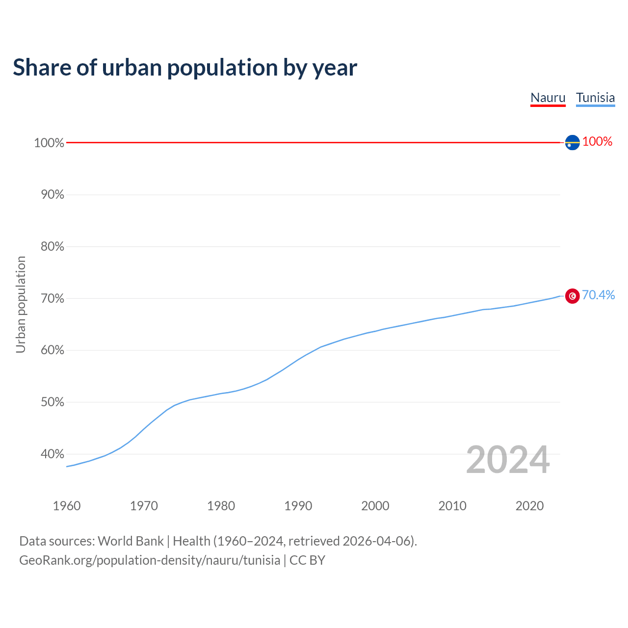 From 2004 to 2024, the share of urban population changed from 100% to 100% in Nauru and from 64.9% to 70.4% in Tunisia.