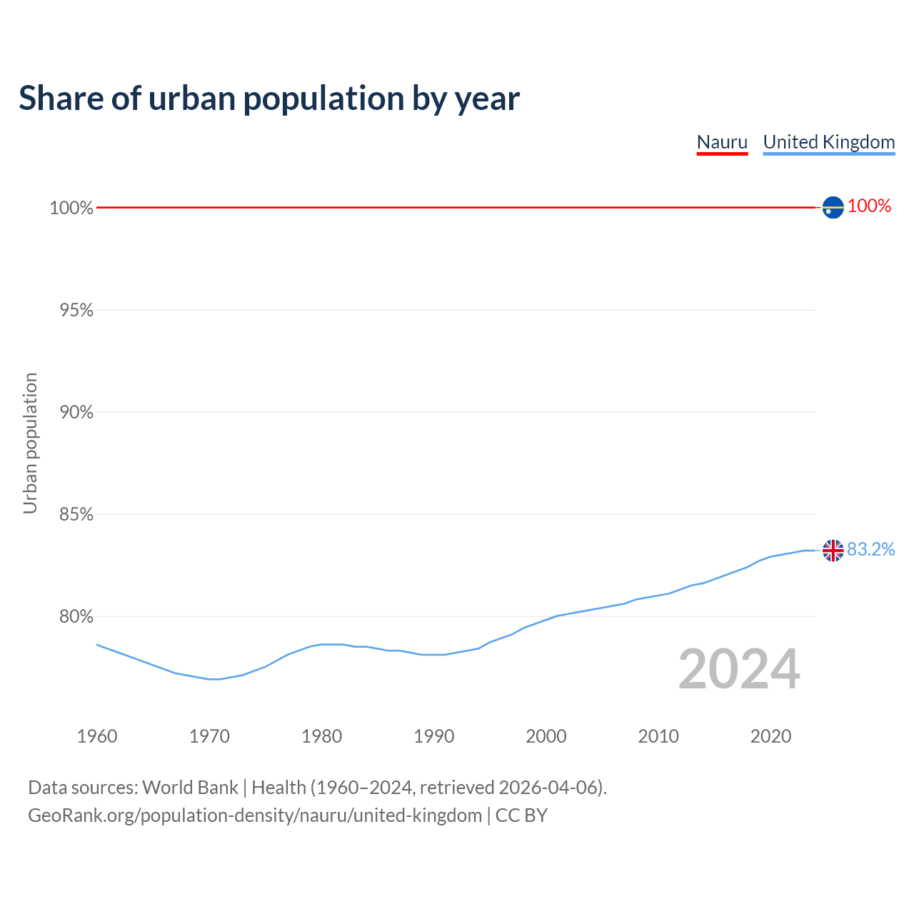 From 2004 to 2024, the share of urban population changed from 100% to 100% in Nauru and from 80.3% to 83.2% in the United Kingdom.