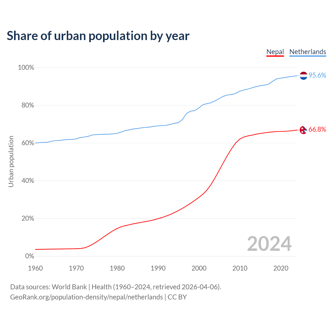 From 2004 to 2024, the share of urban population changed from 41.6% to 66.8% in Nepal and from 82.3% to 95.6% in the Netherlands.