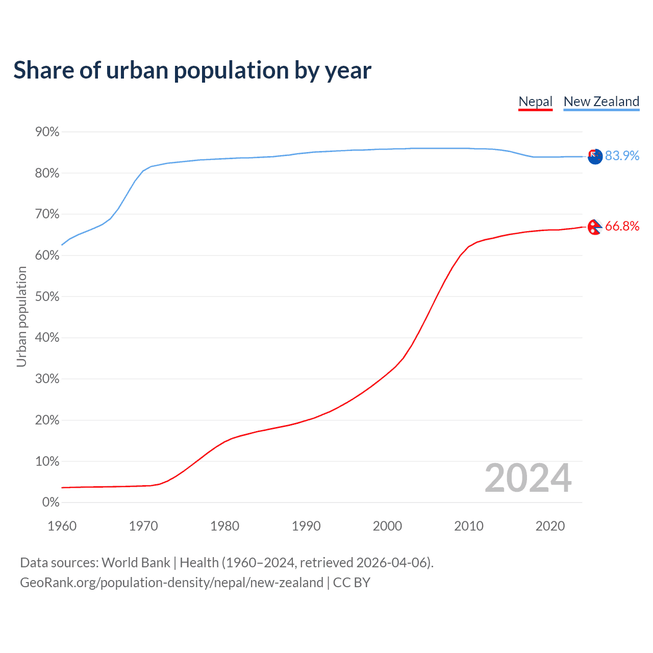 From 2004 to 2024, the share of urban population changed from 41.6% to 66.8% in Nepal and from 85.9% to 83.9% in New Zealand.