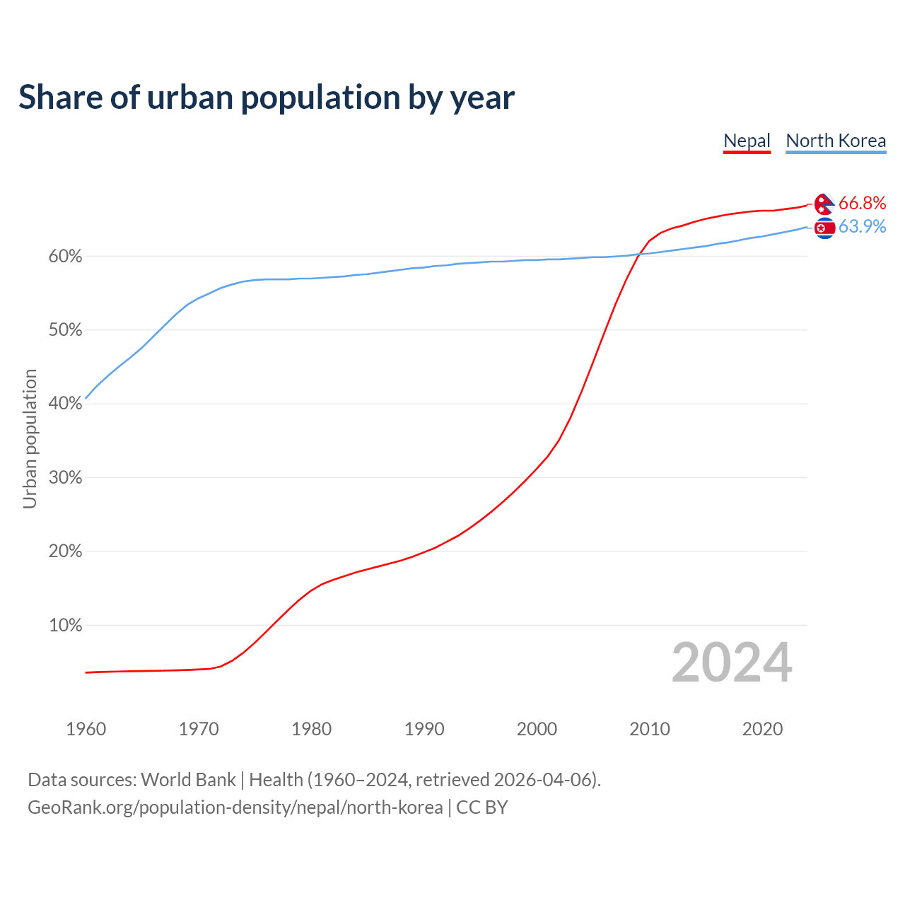 From 2004 to 2024, the share of urban population changed from 41.6% to 66.8% in Nepal and from 59.7% to 63.9% in North Korea.