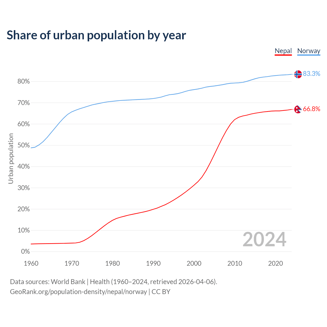 From 2004 to 2024, the share of urban population changed from 41.6% to 66.8% in Nepal and from 77.6% to 83.3% in Norway.