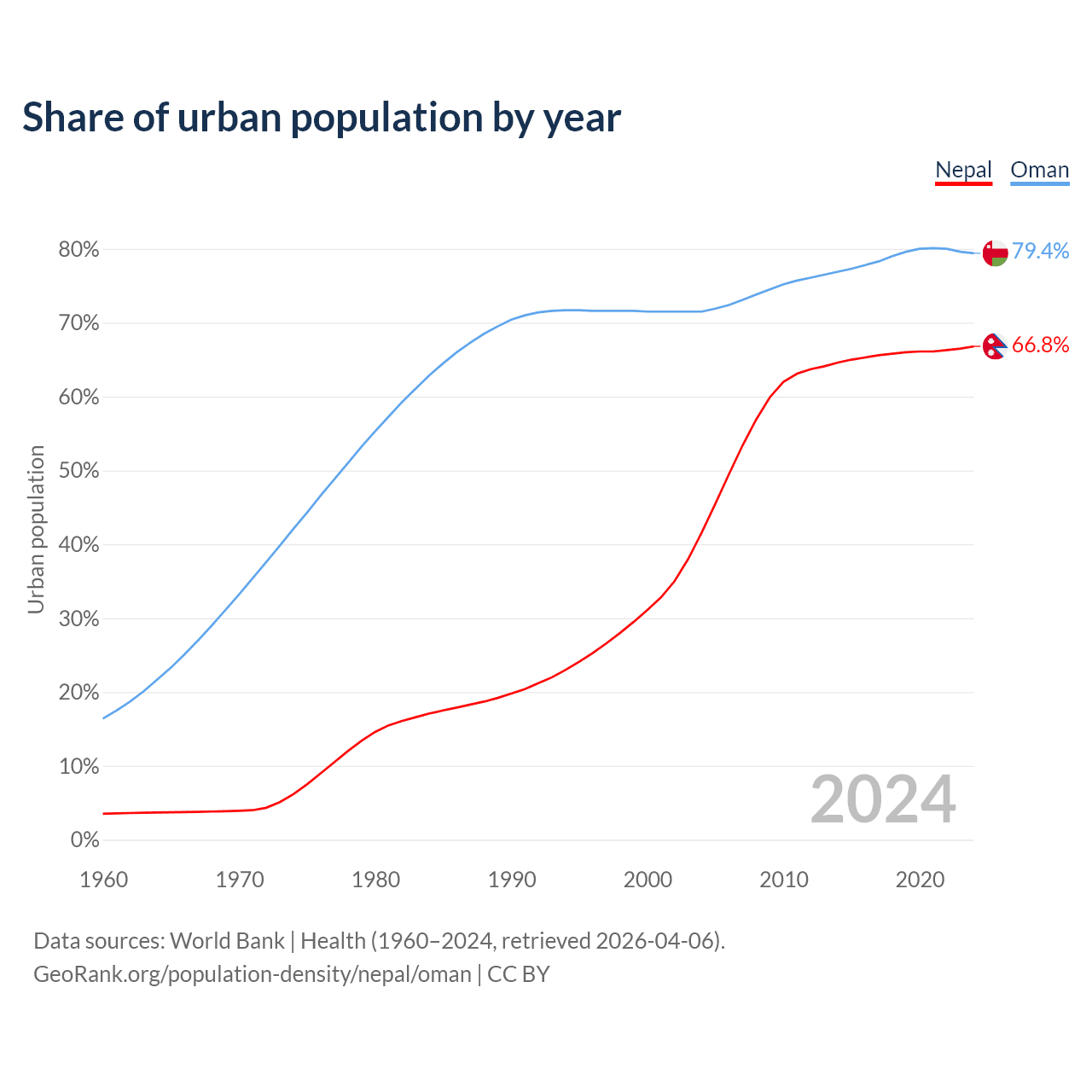 From 2004 to 2024, the share of urban population changed from 41.6% to 66.8% in Nepal and from 71.5% to 79.4% in Oman.