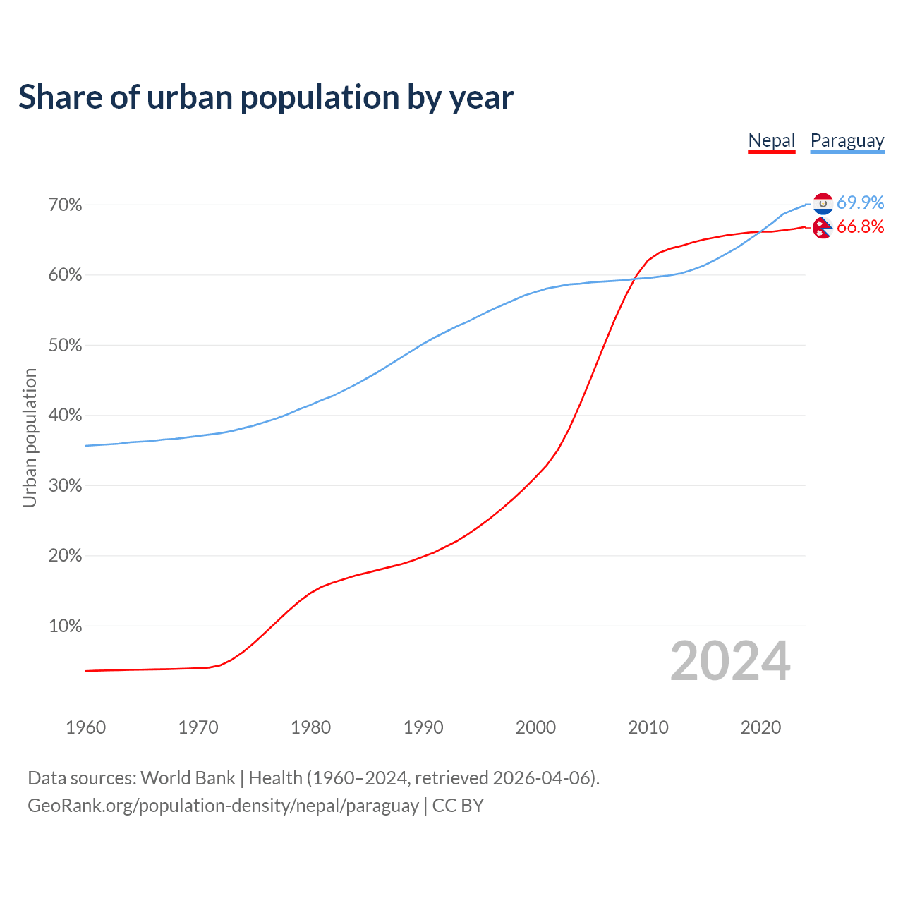 From 2004 to 2024, the share of urban population changed from 41.6% to 66.8% in Nepal and from 58.7% to 69.9% in Paraguay.