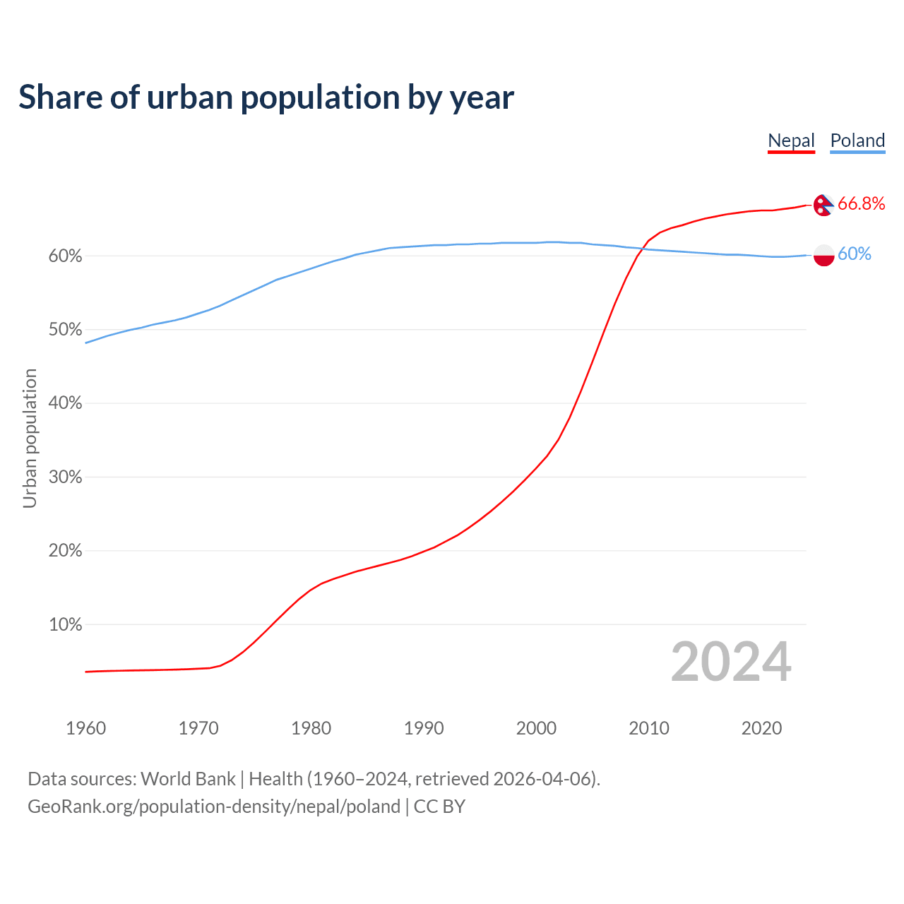 From 2004 to 2024, the share of urban population changed from 41.6% to 66.8% in Nepal and from 61.7% to 60% in Poland.