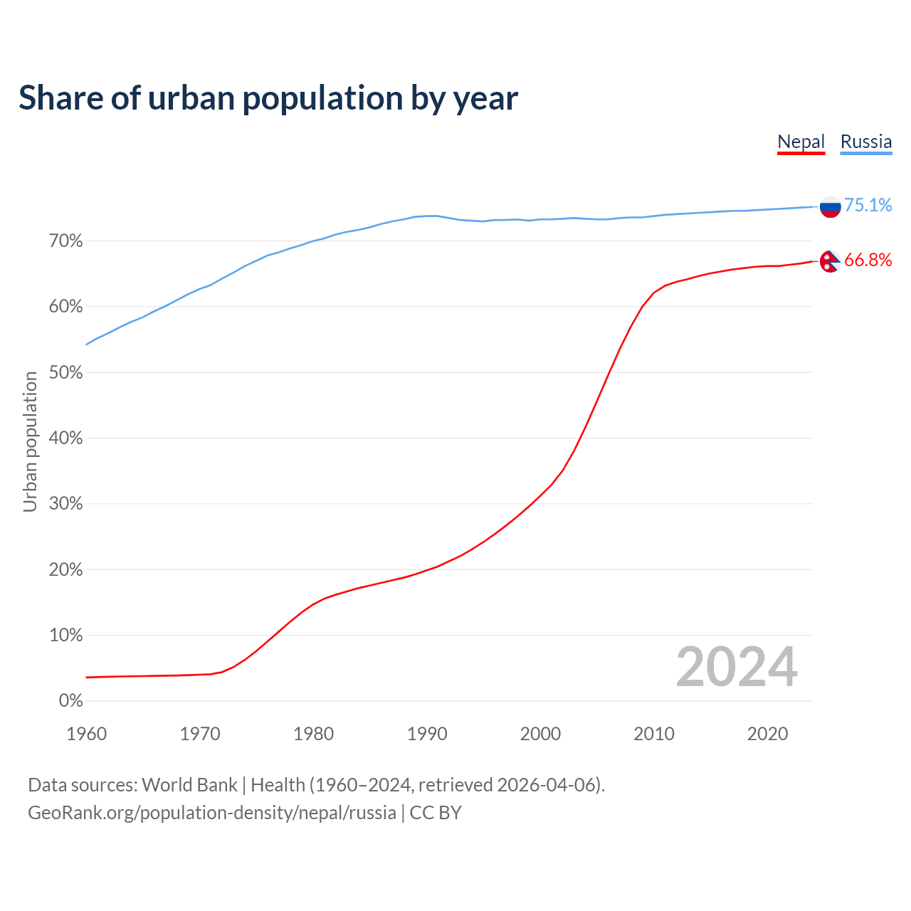 From 2004 to 2024, the share of urban population changed from 41.6% to 66.8% in Nepal and from 73.3% to 75.1% in Russia.