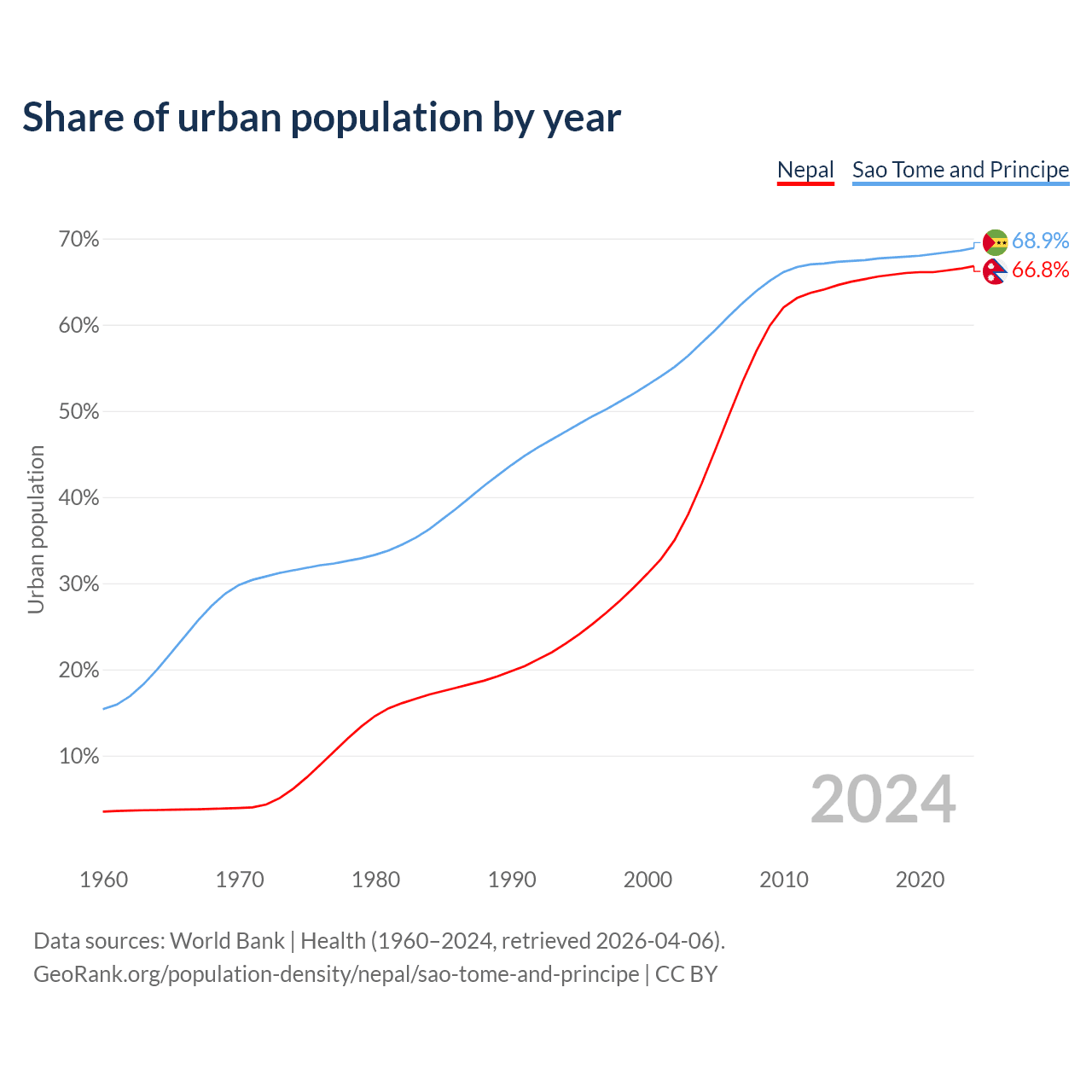 From 2004 to 2024, the share of urban population changed from 41.6% to 66.8% in Nepal and from 57.9% to 68.9% in Sao Tome and Principe.
