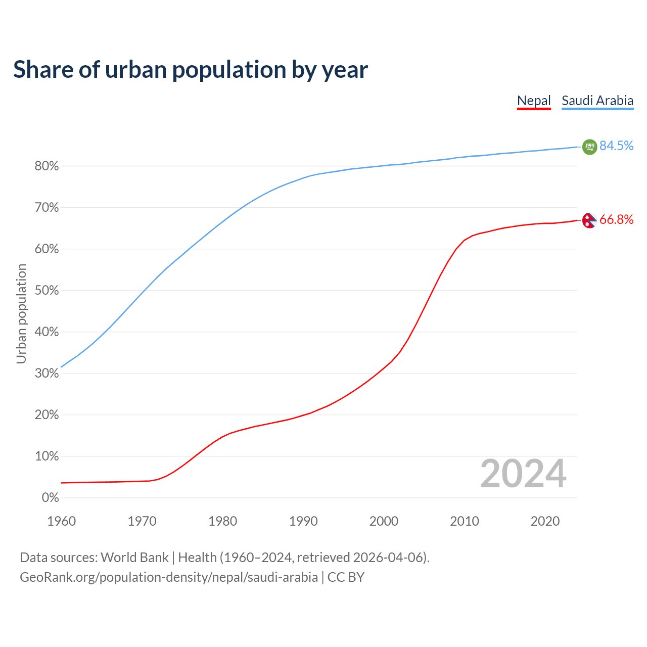 From 2004 to 2024, the share of urban population changed from 41.6% to 66.8% in Nepal and from 80.8% to 84.5% in Saudi Arabia.