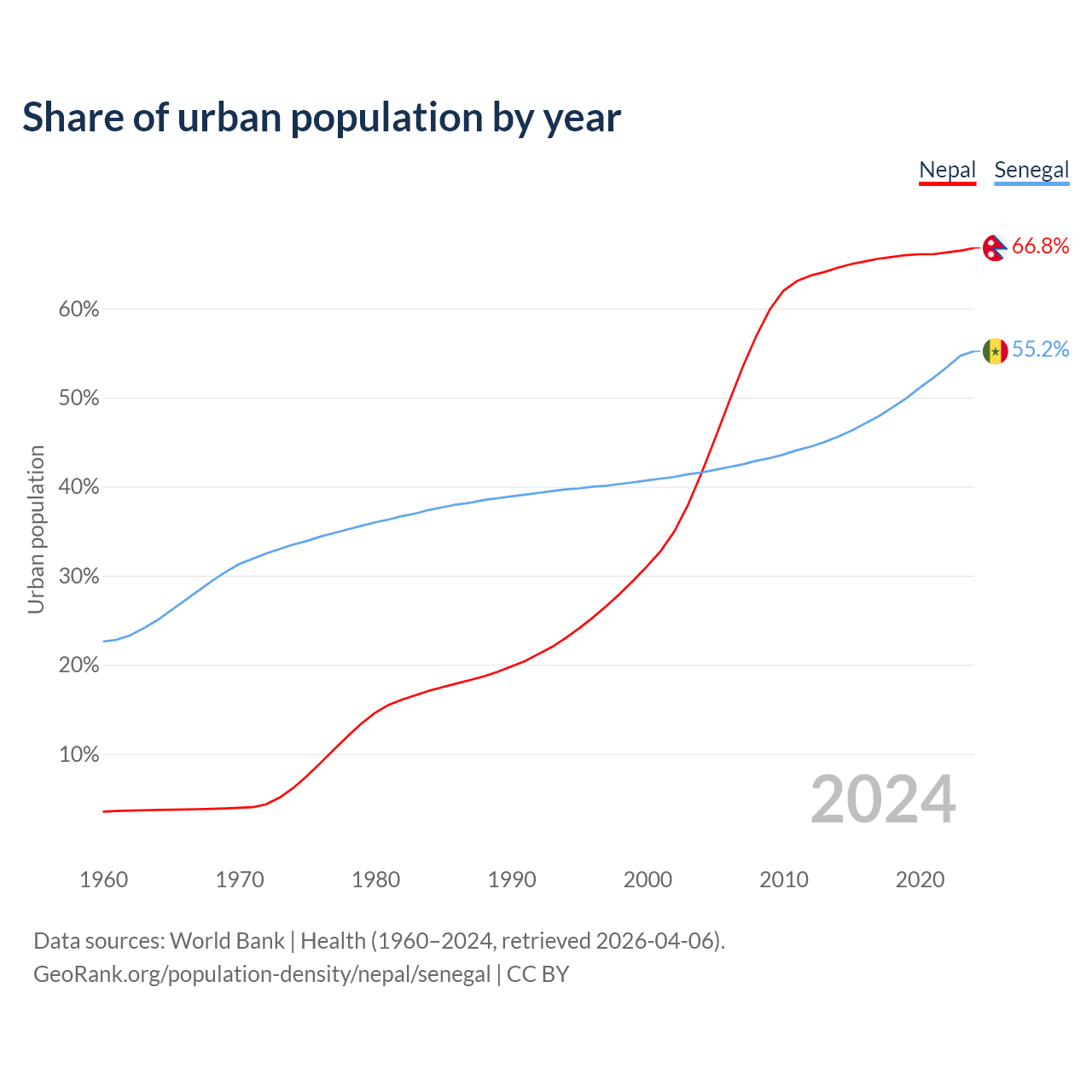 From 2004 to 2024, the share of urban population changed from 41.6% to 66.8% in Nepal and from 41.6% to 55.2% in Senegal.
