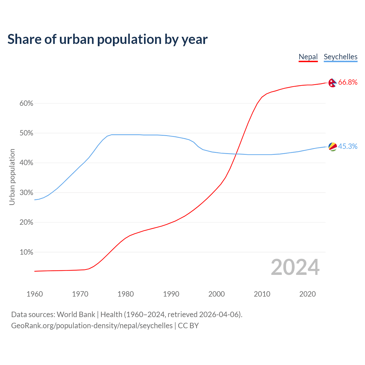 From 2004 to 2024, the share of urban population changed from 41.6% to 66.8% in Nepal and from 42.9% to 45.3% in the Seychelles.