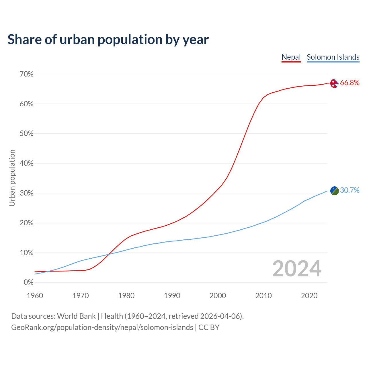 From 2004 to 2024, the share of urban population changed from 41.6% to 66.8% in Nepal and from 17.2% to 30.7% in the Solomon Islands.