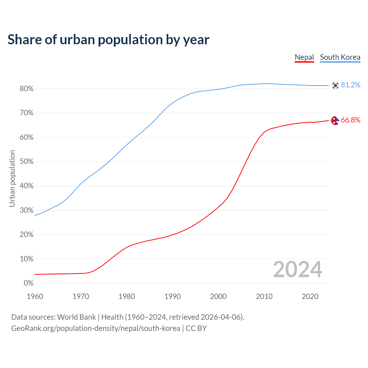From 2004 to 2024, the share of urban population changed from 41.6% to 66.8% in Nepal and from 81.1% to 81.2% in South Korea.