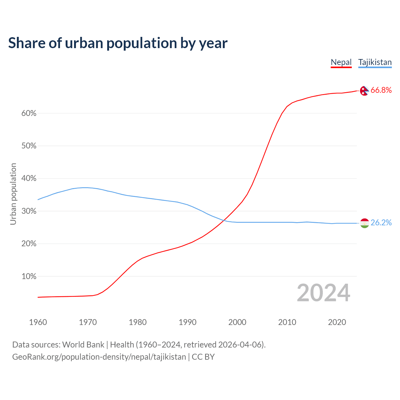 From 2004 to 2024, the share of urban population changed from 41.6% to 66.8% in Nepal and from 26.5% to 26.2% in Tajikistan.