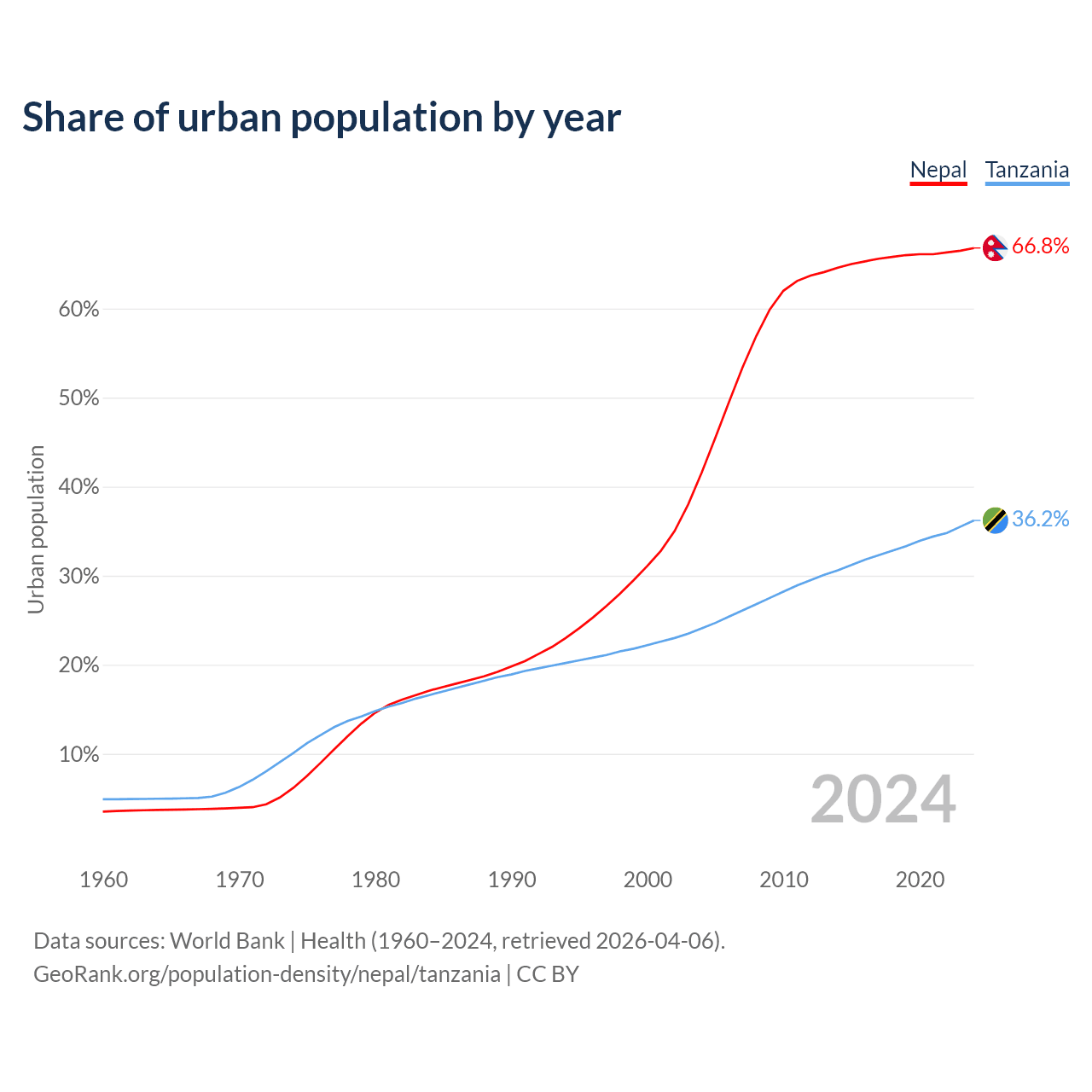 From 2004 to 2024, the share of urban population changed from 41.6% to 66.8% in Nepal and from 24.1% to 36.2% in Tanzania.