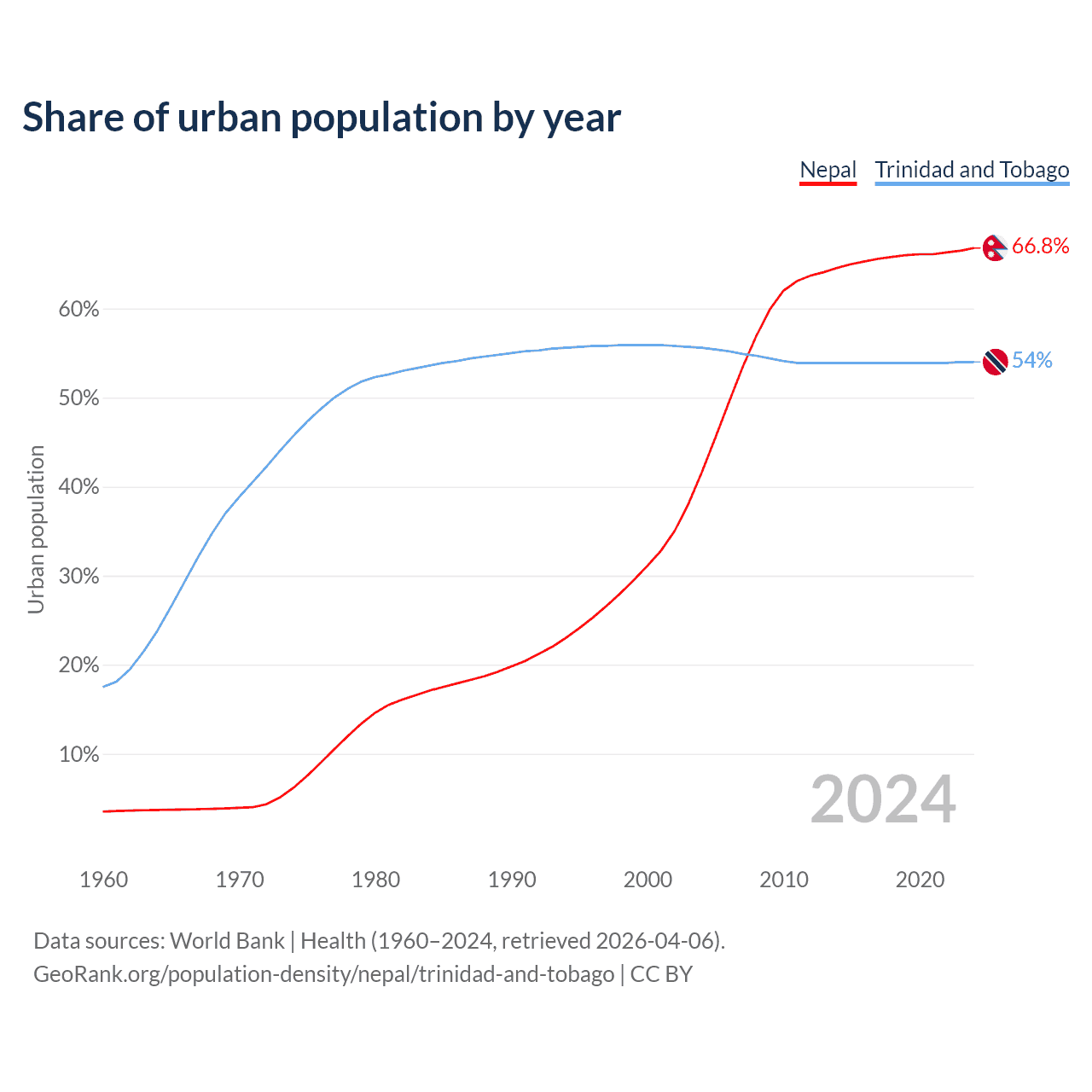 From 2004 to 2024, the share of urban population changed from 41.6% to 66.8% in Nepal and from 55.6% to 54% in Trinidad and Tobago.