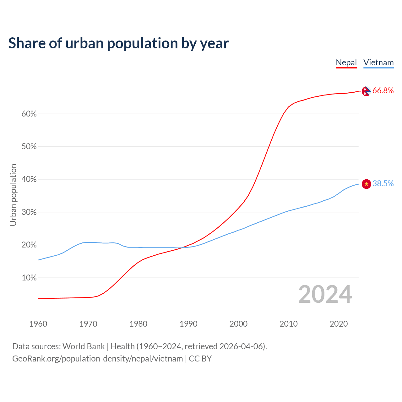 From 2004 to 2024, the share of urban population changed from 41.6% to 66.8% in Nepal and from 26.8% to 38.5% in Vietnam.
