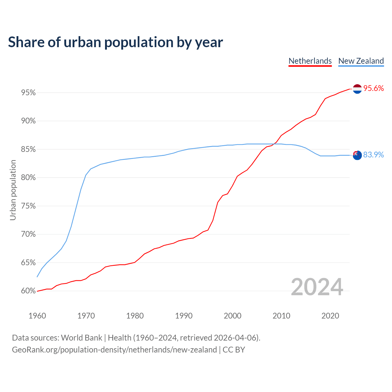 From 2004 to 2024, the share of urban population changed from 82.3% to 95.6% in the Netherlands and from 85.9% to 83.9% in New Zealand.