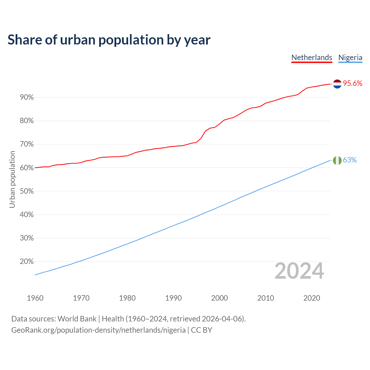 From 2004 to 2024, the share of urban population changed from 82.3% to 95.6% in the Netherlands and from 46.7% to 63% in Nigeria.