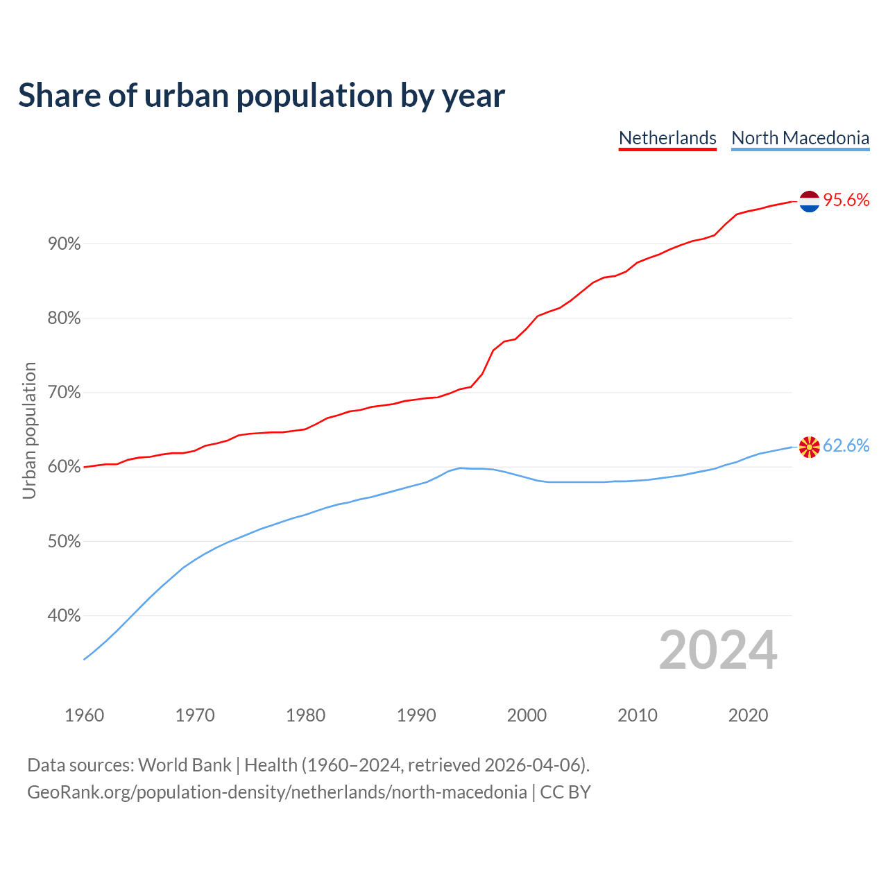 From 2004 to 2024, the share of urban population changed from 82.3% to 95.6% in the Netherlands and from 57.9% to 62.6% in North Macedonia.