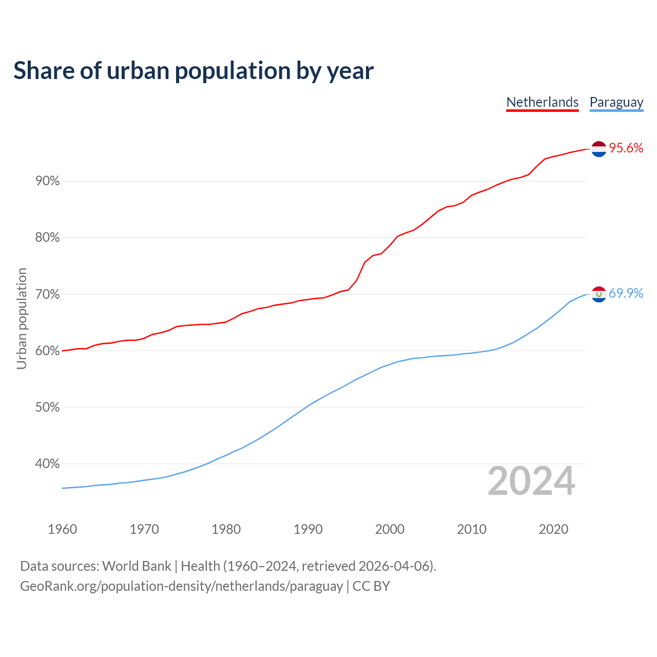 From 2004 to 2024, the share of urban population changed from 82.3% to 95.6% in the Netherlands and from 58.7% to 69.9% in Paraguay.