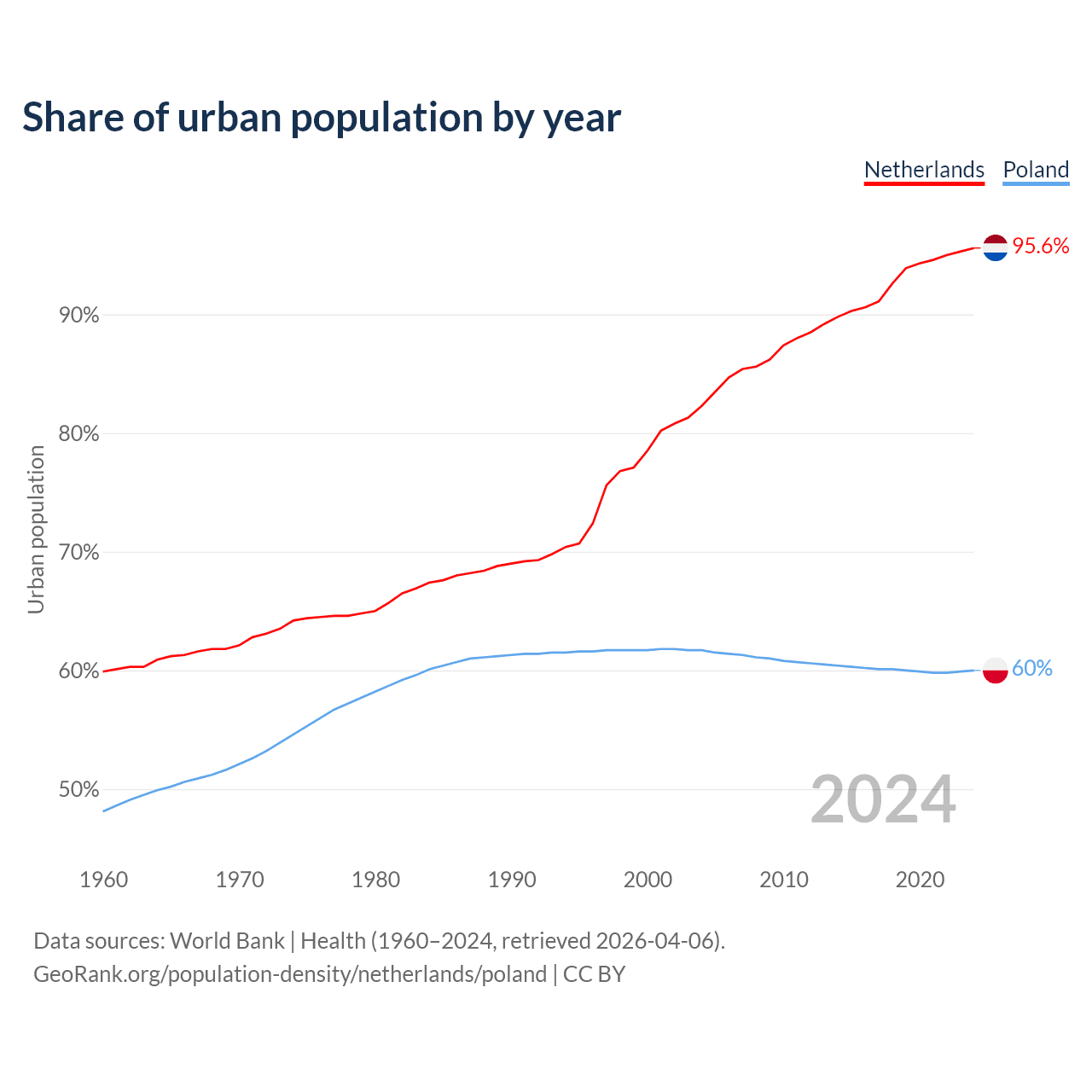 From 2004 to 2024, the share of urban population changed from 82.3% to 95.6% in the Netherlands and from 61.7% to 60% in Poland.