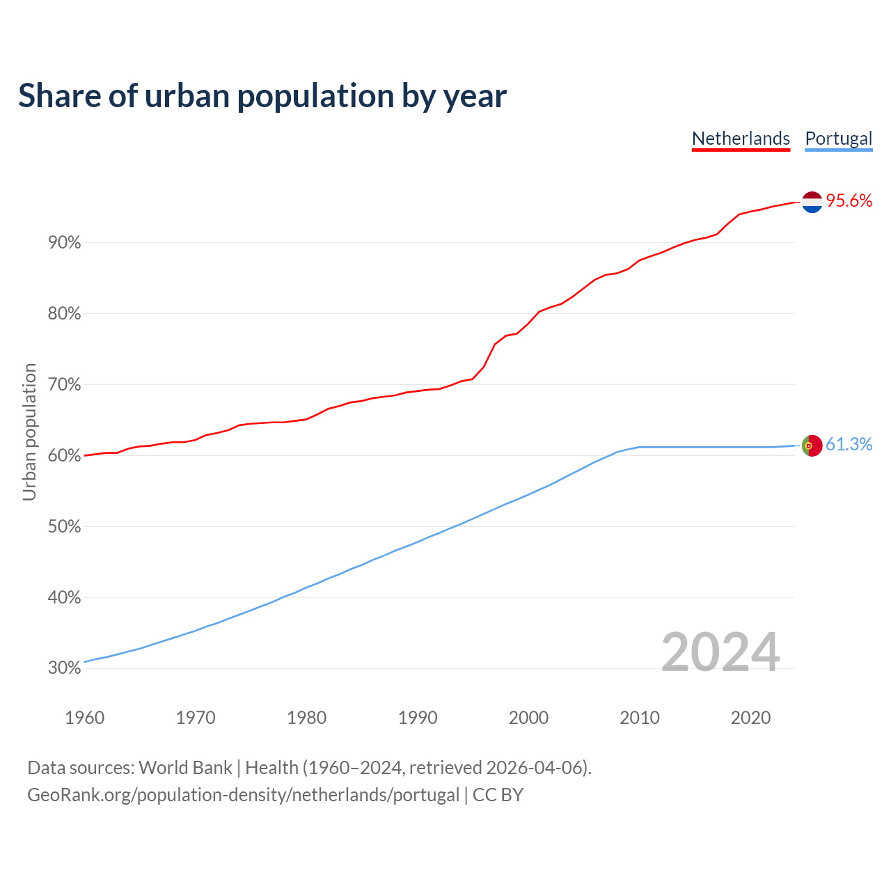 From 2004 to 2024, the share of urban population changed from 82.3% to 95.6% in the Netherlands and from 57.4% to 61.3% in Portugal.