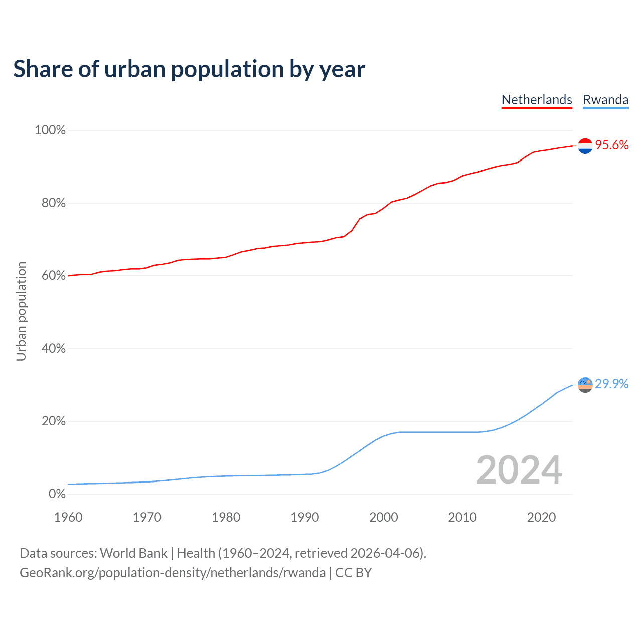 From 2004 to 2024, the share of urban population changed from 82.3% to 95.6% in the Netherlands and from 16.9% to 29.9% in Rwanda.