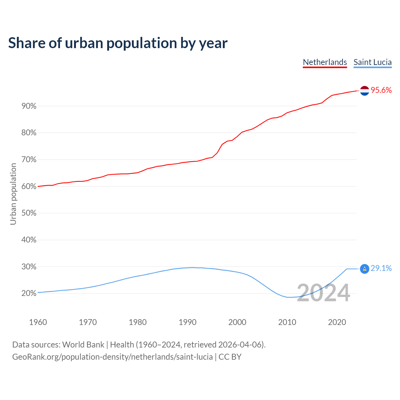 From 2004 to 2024, the share of urban population changed from 82.3% to 95.6% in the Netherlands and from 24.8% to 29.1% in Saint Lucia.