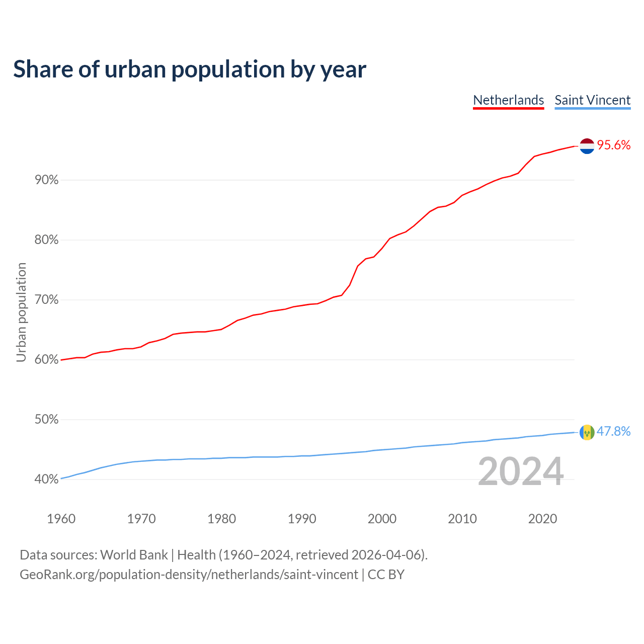 From 2004 to 2024, the share of urban population changed from 82.3% to 95.6% in the Netherlands and from 45.4% to 47.8% in Saint Vincent.