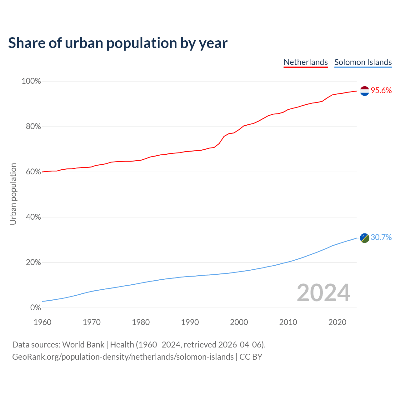 From 2004 to 2024, the share of urban population changed from 82.3% to 95.6% in the Netherlands and from 17.2% to 30.7% in the Solomon Islands.