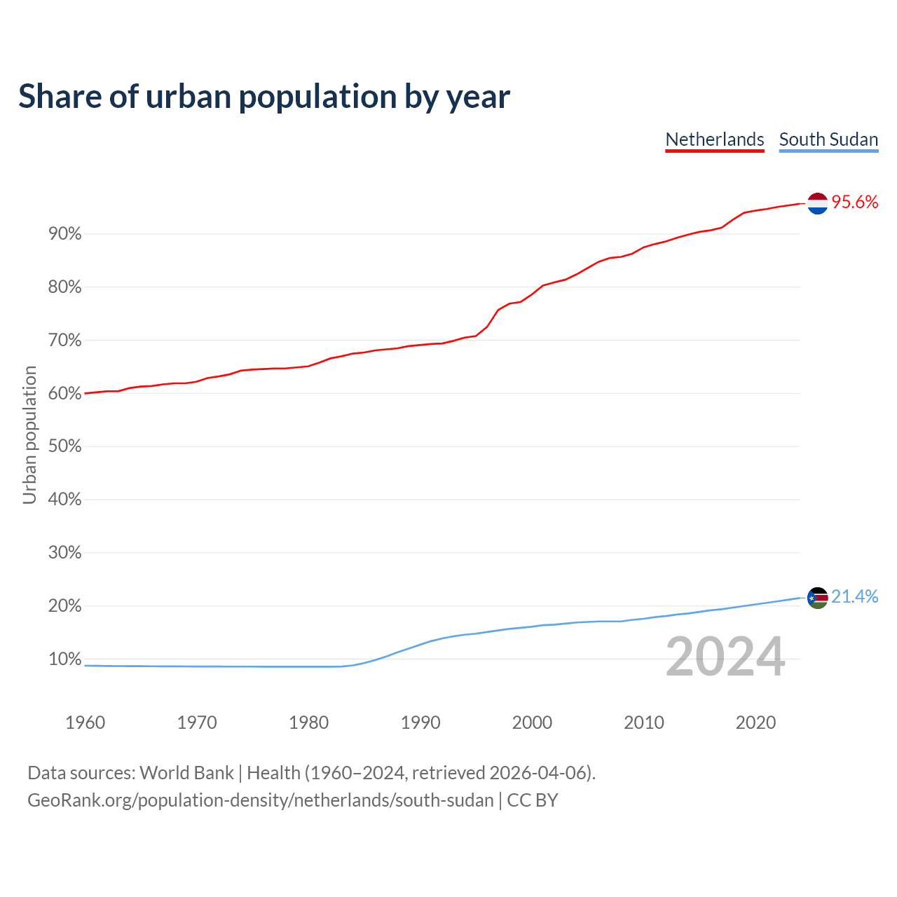 From 2004 to 2024, the share of urban population changed from 82.3% to 95.6% in the Netherlands and from 16.8% to 21.4% in South Sudan.