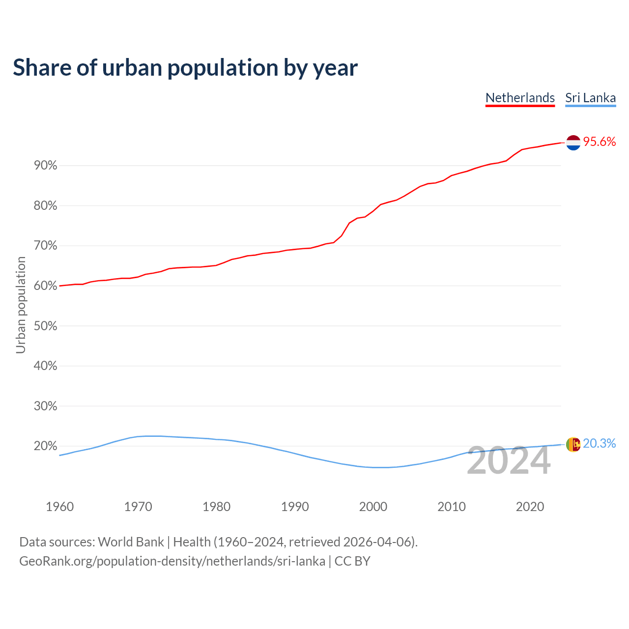 From 2004 to 2024, the share of urban population changed from 82.3% to 95.6% in the Netherlands and from 14.9% to 20.3% in Sri Lanka.