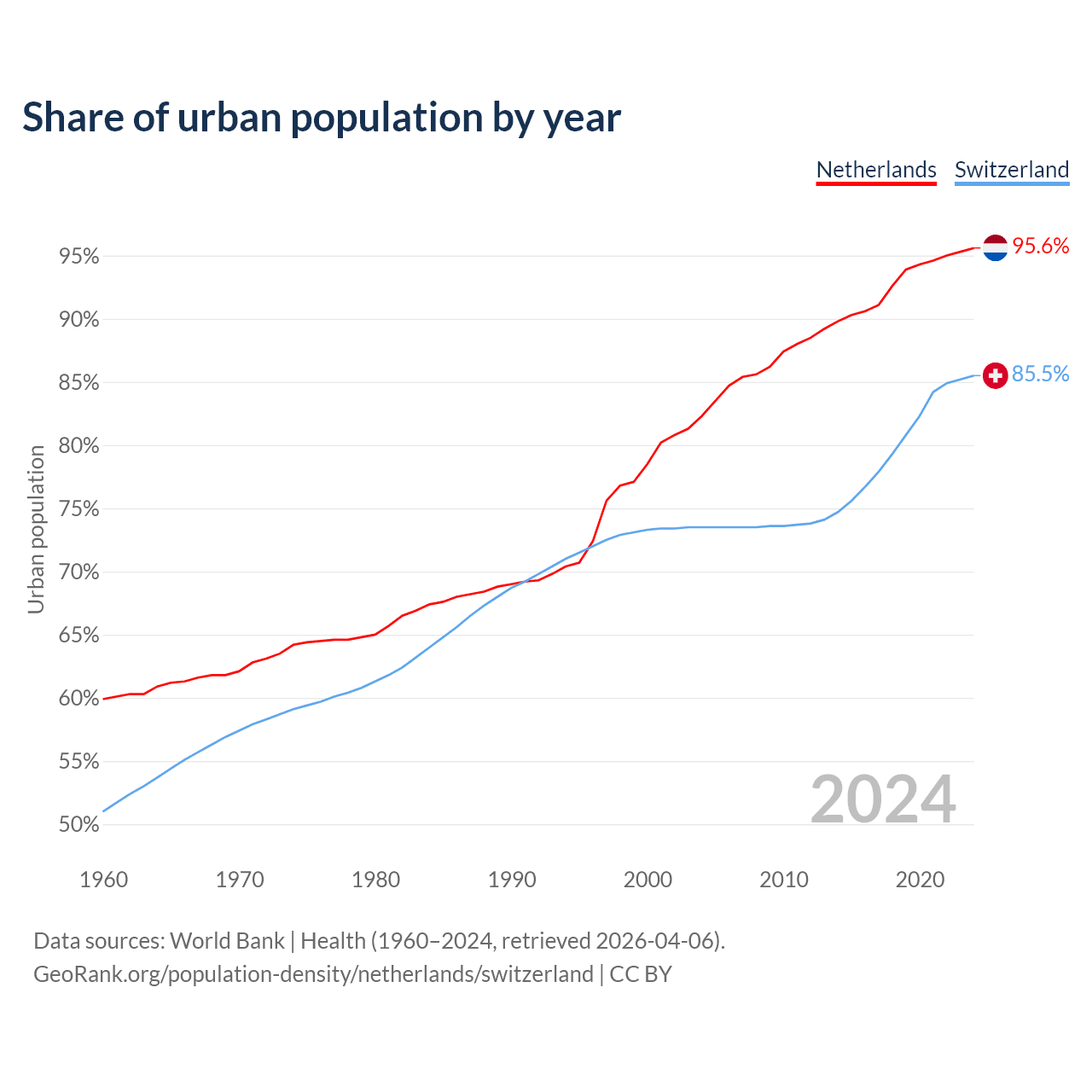 From 2004 to 2024, the share of urban population changed from 82.3% to 95.6% in the Netherlands and from 73.5% to 85.5% in Switzerland.