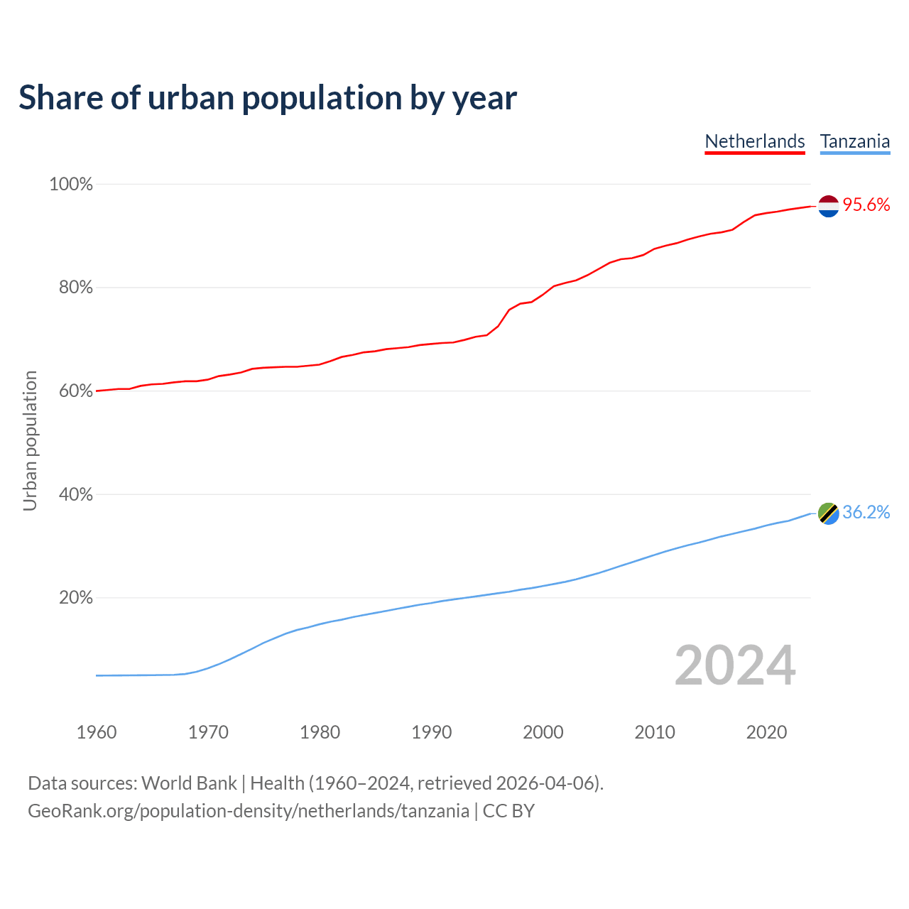 From 2004 to 2024, the share of urban population changed from 82.3% to 95.6% in the Netherlands and from 24.1% to 36.2% in Tanzania.