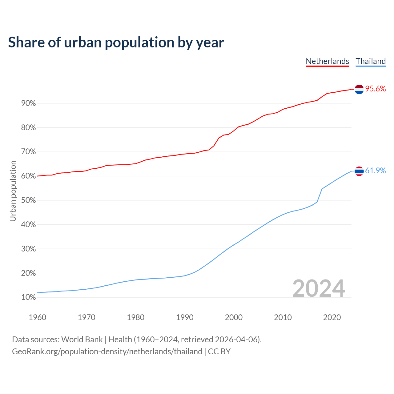 From 2004 to 2024, the share of urban population changed from 82.3% to 95.6% in the Netherlands and from 36.8% to 61.9% in Thailand.