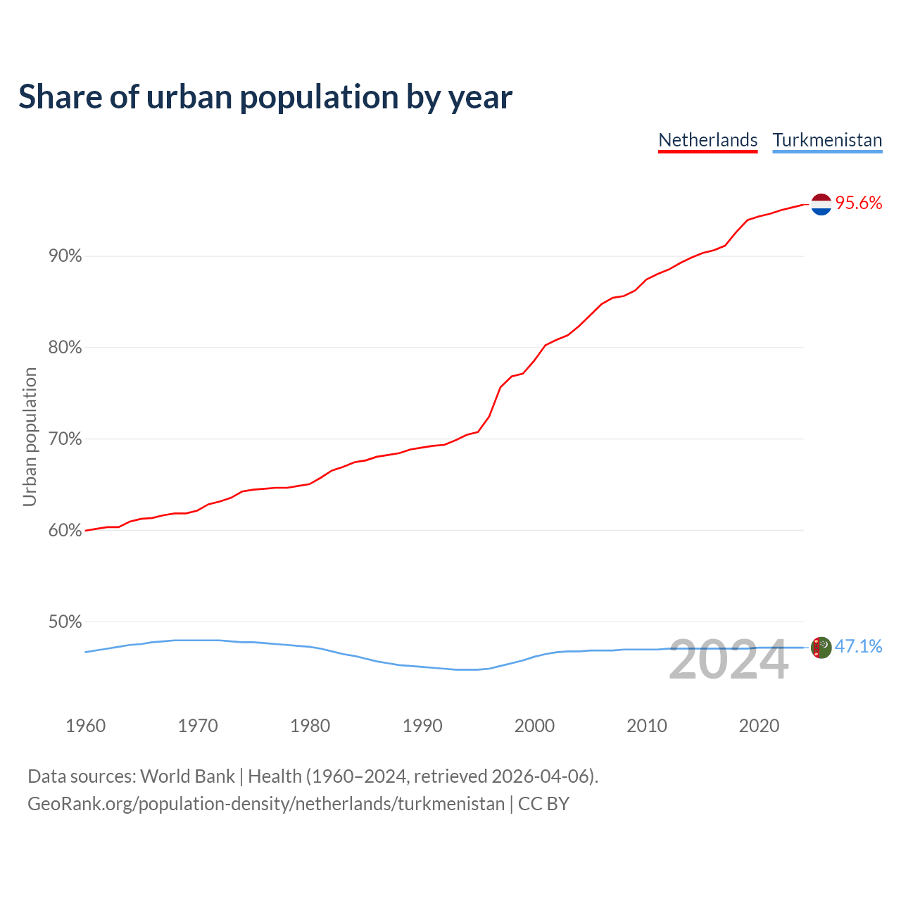 From 2004 to 2024, the share of urban population changed from 82.3% to 95.6% in the Netherlands and from 46.7% to 47.1% in Turkmenistan.