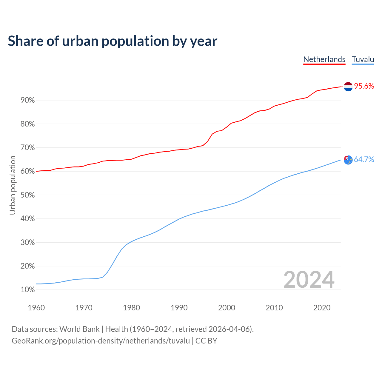From 2004 to 2024, the share of urban population changed from 82.3% to 95.6% in the Netherlands and from 48.4% to 64.7% in Tuvalu.