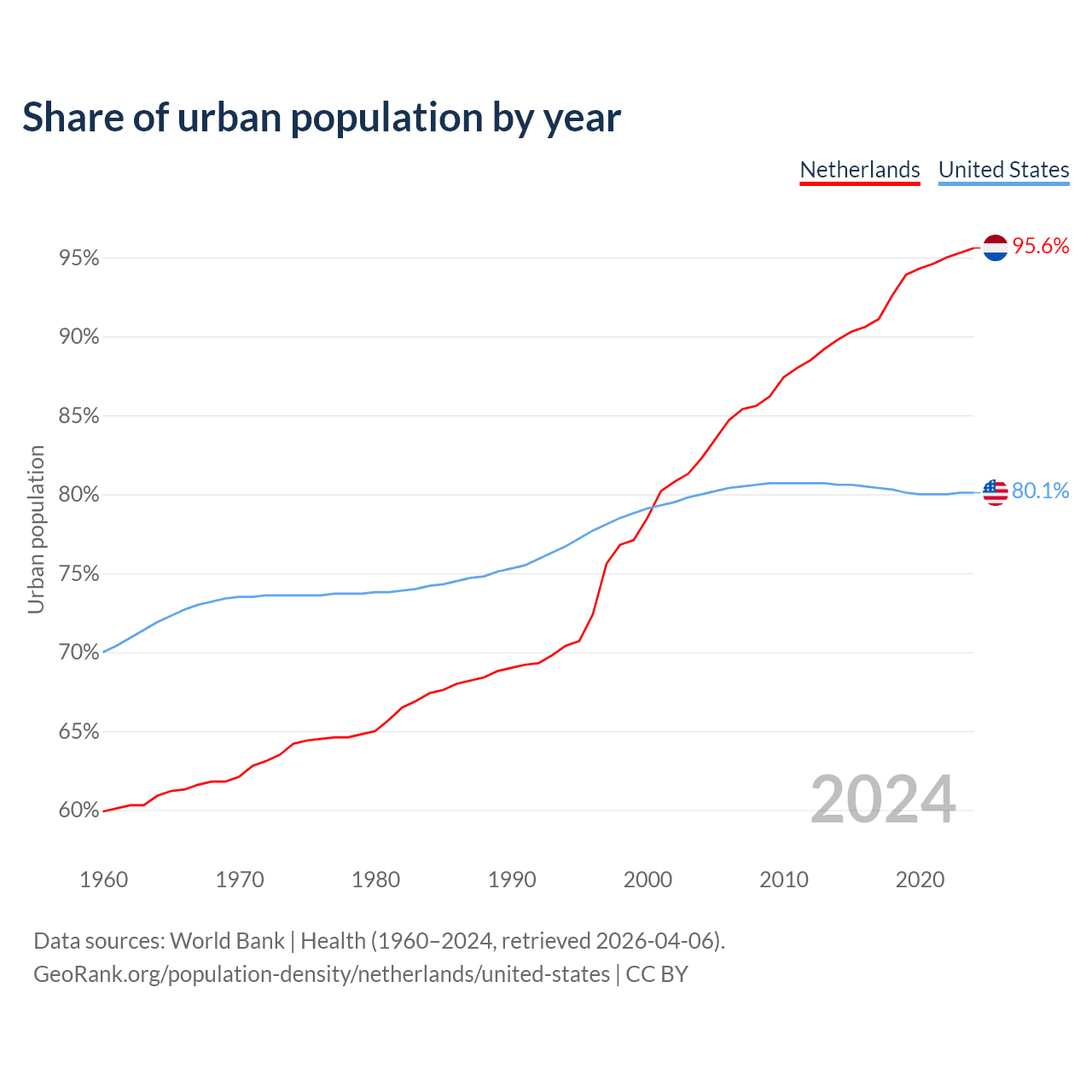 From 2004 to 2024, the share of urban population changed from 82.3% to 95.6% in the Netherlands and from 80% to 80.1% in the United States.