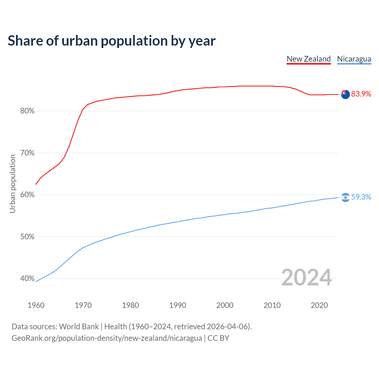 From 2004 to 2024, the share of urban population changed from 85.9% to 83.9% in New Zealand and from 55.8% to 59.3% in Nicaragua.